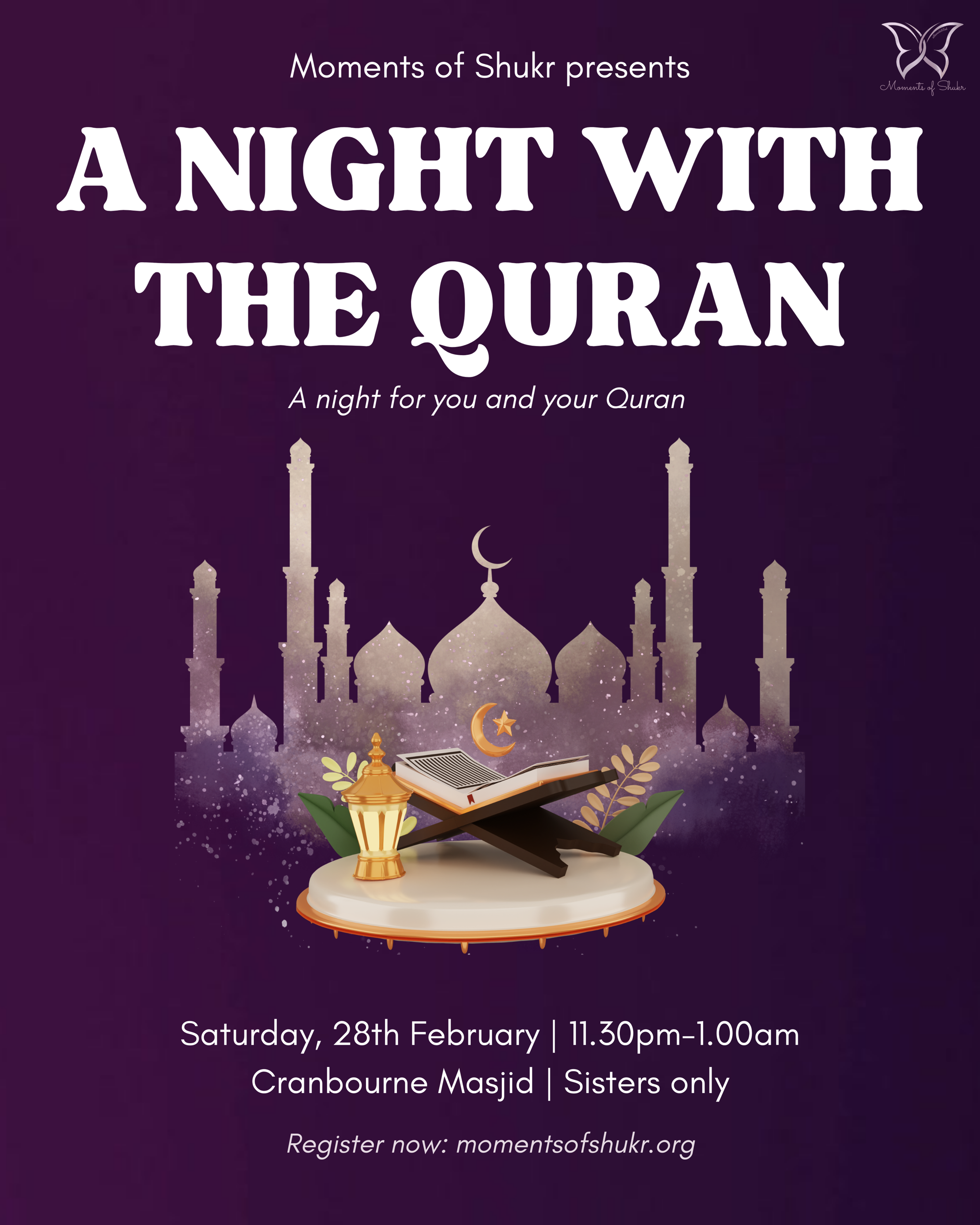Join us for a sisters-only Quran night designed to help you focus, reset and power through your personal Quran goals in a supportive, distraction-free space.